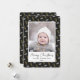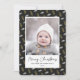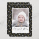 Enviar cartões de natal personalizáveis e personalizados a amigos, colegas e familiares em cartões com fotos simples, minimalistas, elegantes, divertidos, festivos e modernos! Um belo quadro de variedade de ouro e bolotas brancas de árvore de pinheiro de Natal em fundo preto rodeia sua foto em papel redondo. A saudação "Feliz Natal" está escrita em caligrafia elegante, e abaixo apresenta sua mensagem de saudação personalizada do nome da sua família na tipografia moderna. Inverta para revelar um belo fundo do padrão das Acorns de Árvore de Pinheiro de Natal de cheio.