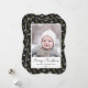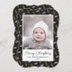 Enviar cartões de natal personalizáveis e personalizados a amigos, colegas e familiares em cartões com fotos simples, minimalistas, elegantes, divertidos, festivos e modernos! Um belo quadro de variedade de ouro e bolotas brancas de árvore de pinheiro de Natal em fundo preto rodeia sua foto em papel colchete. A saudação "Feliz Natal" está escrita em caligrafia elegante, e abaixo apresenta sua mensagem de saudação personalizada do nome da sua família na tipografia moderna. Inverta para revelar um belo fundo do padrão das Acorns de Árvore de Pinheiro de Natal de cheio.