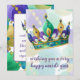 Tilted mardi gras crown sitting in front of mardi gras beads on this fully customizable mardi gras greeting card. The reverse of the card has room to customize your message and add your signature line.