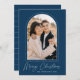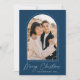 Cartão de Natal moderno com a sua foto vertical moldada por um arco pontilhado com um fundo azul escuro (ou cor da sua escolha). "Feliz Natal" é exibido em letras de roteiros brancos. Personalize a frente do cartão, adicionando o nome da sua família e o ano. A placa se inverte para exibir um padrão de linha pontilhada branca.