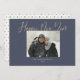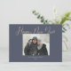 Estes simples cartões de saudação de ano novo com fotos de solteiro de 7" x 5" apresentam a saudação, o Feliz ano novo, em uma imagem de fundo azul de marinho com espaços reservados para sua foto favorita, nome da família e ano. Veja a bolinhas de coordenação na parte traseira da placa!