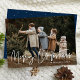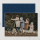 Cartões com fotos modernos de férias com sua foto horizontal com "Feliz Natal", mostrados em um roteiro escrito à mão. Personalize o cartão fotográfico de Natal com seu nome de família e o ano. A placa de feriado de fotos do solteiro é revertida para exibir um plano de fundo do marinho com pontos brancos sutis.