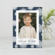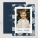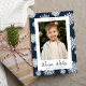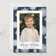 Cartão com fotos de feriado bonito com sua foto vertical moldada em branco com um fundo de marinho e flocos de neve brancos. "Desejos Quentes" é exibido em um roteiro de marinho caprichoso. Personalize o cartão com fotos de festas de neve com o ano e seu nome familiar. A placa reverte para exibir sua mensagem personalizada em letras brancas com um fundo de marinho sólido.