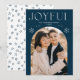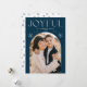 Deseje aos entes queridos uma feliz temporada de festas enviando-lhes um cartão de festas de tendências projetado por Late Bloom Paperie! A placa de feriado exclusiva apresenta a sua dentro de foto de um quadro de fotos em arco de marinho. "Joyful" aparece no topo em letras brancas modernas, acentuadas por flocos de neve desenhados à mão. Personalize a frente do Cartões de foto de Natal adicionando seu nome e o ano. A parte de trás do cartão de feriado fotográfico mostra um padrão de floco de neve de marinho.