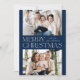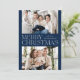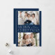 Cartões de foto de Natal moderno com "Feliz Natal", exibido no centro do design em letras brancas de tendência com fundo de marinho. Personalize o simples cartão de Natal com seu nome de família e duas fotos horizontais. A placa reverte para exibir um plano de fundo do marinho com pontos brancos sutis (neve).