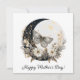 Aproveite este lindo design de mariposa floral e lua com um modelo de texto Feliz Dia das Mães! Modelos de foto e linha de assinatura no verso. Flores brancas com folhas prateadas, mariposa prateada e lua crescente preta.