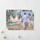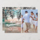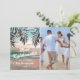 Cartão de Natal havaiano alegre com foto da sua família, as palavras "mele kalikimaka", fundo de praia, folhas de palmeira e luzes de Natal.