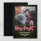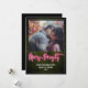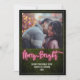 Design inspirado em letreiro neon rosa "Merry + Bright" com fundo de verde buxo e acabamento branco. Personalize o texto e a foto.