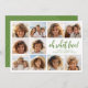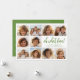 Frente - Um modelo de 10 fotos em uma grade simples com uma borda branca. Fundo branco com um script divertido e uma fonte sans serif para a saudação. O tipo está em verde-muda. Fundo - Sage verde com uma fina linha de arte zen arch. Todas as cores podem ser alteradas na área design avançada.