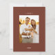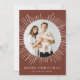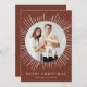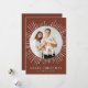 Na moda e cartão de feriado moderno com a sua dentro de foto aninhada de um quadro circular branco de explosão solar. Personalize o cartão de Natal do sunst com o seu nome familiar em letras brancas num fundo castanho de canela ou numa cor da sua escolha. A parte traseira do cartão exibe o ano e uma foto adicional.