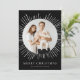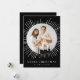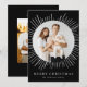 Na moda e cartão de feriado moderno com a sua dentro de foto aninhada de um quadro circular branco de explosão solar. Personalize o cartão de natal sunst com o seu nome familiar em letras brancas num fundo preto ou numa cor da sua escolha. A parte traseira do cartão exibe o ano e uma foto adicional.