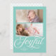 Na moda Joyful Holiday Cartão com fotos que pode mostrar 2 de suas fotos contra um fundo leve de sombra de chá aqua e apresentando a palavra "Joyful" em um belo roteiro cursivo. A placa inclui o padrão geométrico do tom aqua em relação a um fundo branco. Veja outros itens de feriado aqui https://www.zazzle.com/collections/holiday_christmas_new_year_cards-119015800351034065?rf=238364477188679314 Personalize-o substituindo o texto do marcador de posição e substitua as fotos de amostra/marcador de posição por suas próprias fotos. Para obter mais opções, clique no botão "Personalizar". Marca de fotografia © Storytree Studios, Stanford, CA *Note que a Marca d'água Zazzle que aparece na visualização de zoom NÃO aparecerá no produto impresso final. © Rosewood e Citrus