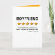 Cartão do Dia dos Namorados engraçado com a palavra "namorado", com uma avaliação de 5 estrelas, o comentário "engraçado, forte, um prazer de usar, recomendo muito um", e seu nome.
