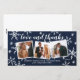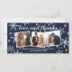 Espalhe amor nesta temporada de festas com este cartão de natal completamente personalizado com um cartão de agradecimento de recém-casados. Ele apresenta 3 fotos e flocos de neve desenhados à mão e efeito de textura azul-marinho ao fundo.