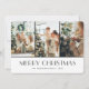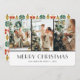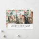 Foto: Feliz cartão de Natal com colagem fotográfica na frente e um padrão de Natal de presentes, ornamentos, luvas e neve caindo nas costas. Personalize facilmente este cartão de feriado moderno com as suas fotografias e texto favoritos.