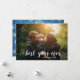 Um design moderno e divertido, apresentando uma tipografia elegante que diz, "melhor ano de sempre". Este cartão de foto contém 2 modelos de foto, mas o verso pode ser removido, se desejado. Como projetado, este cartão permite uma mensagem pessoal no verso.