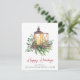 Cartão de cartões de natal elegante para a sua empresa com uma ilustração aquosa de uma lanterna de velas de Natal num arranjo de pinheiros sazonais, bagas de eucalipto e verde e "Feriados Felizes" escritos em um roteiro vermelho contemporâneo. Personalize sua saudação e o nome de sua empresa em uma simples tipografia moderna.