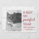 cartão de Natal engraçado vermelho e cinza de 2020, um gato não tão perfeito ano piada com uma foto de animal de estimação personalizada e um fundo vermelho com flocos de neve atrás