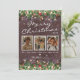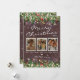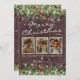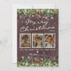 Celebre a temporada de festas com estes cartões de natal rústicos personalizados com 3 fotos da família para serem substituídas pelas suas, um fundo de madeira escura, ramos de árvore de natal festivos, decorações de árvore vermelhas e douradas, luzes cintilantes, seu nome e o ano.