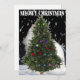Um gato se escondendo atrás de uma árvore de Natal decorada com olho de gato
