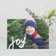 Este ousado e artístico anúncio de cartão de Natal com foto apresenta uma grande obra de arte manuscrita e móvel alegria em branco sobre uma foto do cliente em bleed full com uma linha de texto editável simples em branco.