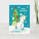 Envie a um Excelente especial para o sobrinho um cartão de Natal divertido e colorido, com um feliz boneco de neve com uma colorida árvore de Natal e flocos de neve em um fundo de turquesa. Homem de neve cortesia do Bonito Grafik.