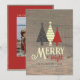Elegante, único, simples, cartão de Natal moderno e retro Alegre e Brilhante, preto, amarelo e vermelho, com árvores de pinheiro coloridas, madeira rústica e foto no verso.
