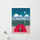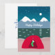 Este cartão de férias plano para os campistas tem uma tenda vermelha na borda do lago, com montanhas com capas de neve no fundo e um céu estrelado com uma lua de cheio acima. O campista está pronto para Papais noeis e pendurou um estoque verde e branco em sua tenda.