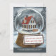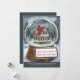 Cartão de Natal do novo endereço. Design apresenta uma casa em um globo gigante de neve em uma floresta de neve com placa de jardim editável para seu cartões de natal. A placa lê atualmente "desejos de natal de nossos novos digs" e você pode editá-los se desejar. Há também um painel de texto personalizado na parte inferior para que todos saibam a mudança de endereço.