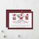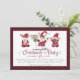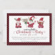 "Lindo Cartão de Férias de Nomes Aquarela Festa de Natal Feliz." Ilustração caprichosa e divertida de aquarela de uma família de gnomos e seus renques convidam você para uma Festa de Natal Feliz! Xadrez Buffalo vermelho e preto definido nas bordas de diamante na frente e preenche a parte de trás. Arte por Audrey Jeanne Roberts, direitos autorais.