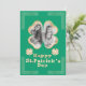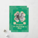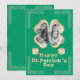 Este cartão de saudação personalizado do Dia de São Patrício apresenta uma moldura de foto de trevo da sorte em um fundo verde. A moldura do trevo apresenta um brilho dourado e um design de folha verde. Uma foto de amostra é colocada dentro, que você pode personalizar para incluir sua própria foto personalizada ou outra imagem. A saudação "Feliz Dia de São Patrício" é impressa em uma fonte borbulhante de folha verde e brilho dourado correspondente. Dois trevos são colocados de cada lado. Nós Celtas enquadram os cantos do convite.