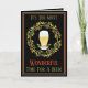 Divertido design de Natal para os amantes de cerveja! O design apresenta uma coroa de Natal feita de folhas de azevinho e bagas. No centro da coroa há um copo de cerveja. O copo de cerveja está cheio de cerveja espumosa. Na parte inferior do copo de cerveja há um raminho de azevinho. Acima e abaixo da coroa há um texto em fonte verde e vermelho-laranja que diz "É a época mais maravilhosa para uma cerveja!". O fundo do design é preto com acabamento verde e vermelho-laranja. O interior do cartão tem o mesmo fundo preto com acabamento verde e vermelho. Há uma foto de uma cerveja sendo despejada de uma garrafa em um copo de cerveja. Abaixo da foto há um texto personalizável em fonte cinza escuro e vermelho-laranja onde você pode deixar o texto como está ou personalizar com sua