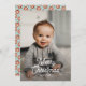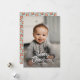 Cartão de Natal personalizado com uma foto com uma camada de neve na frente e um padrão de ornamentos no verso.
