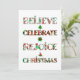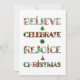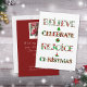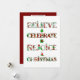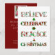 Espalhe o espírito natalino com este design fofo e estampado que apresenta "Acredite, Celebre, Alegre-se, Natal" em tipografia festiva repleta de motivos natalinos vermelhos e verdes. Cada letra exibe enfeites, árvores de Natal, poinsettias e padrões sazonais clássicos que trazem alegria e calor às suas celebrações.