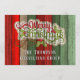 Um cartão de cartões de natal de Natal bonito, único, clássico, moderno, bonito e decorativo, com um clássico vermelho-escuro Holiday, verde-florestal e um texto de "Feliz Natal" de cor branca, num contexto de planícies com estilo caseiro de madeira rusticada, de madeira casada e casada. Com espaço para personalizar ou personalizar facilmente com o nome da sua empresa ou família, e espaço no fundo para escrever ou impressão o seu próprio desejo de Feriado.