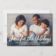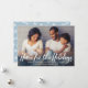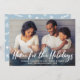 O design "Home for the Holidays" apresenta a inscrição moderna de scripts brancos e bruxos, juntamente com o texto personalizado que pode ser personalizado como uma sobreposição com uma foto de família horizontal favorita em casa. Um padrão de inverno moderno se veste na parte de trás do cartão. A cor de fundo azul poeirento pode ser modificada.