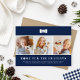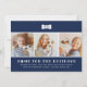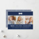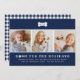 Nosso cartão de Natal "Home for the Holidays" para o cão de estimação apresenta uma colagem de três fotos quadradas do seu novo cachorro para compartilhar com amigos e familiares. Personalize o texto com uma saudação personalizada, seu sobrenome ou família, o nome de seu filhote e o ano. O design azul marinho moderno inclui uma pintura fofa, osso do cão e um padrão de xadrez gingham/búfalo coordenado no verso.