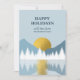 Um belo design que mostra uma floresta coberta de neve, paisagem montanhosa e um pôr do sol ou nascer do sol dourado refletindo na água. Os tons de cor incluem tons neutros como azul, branco e dourado. Um design rústico ideal para a decoração de inverno em casa e a temporada de festas.