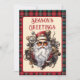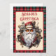 Cartão de férias exclusivo apresenta um Papai Noel Steampunk estilo vintage com óculos de sol hipster retrô em um fundo xadrez festivo, Personalize sua saudação com texto personalizável em uma fonte vintage. Este design de arte digital foi criado com a ajuda de software de IA.