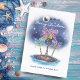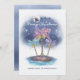 Tropical, tema da praia O cartão de Natal apresenta uma ilha espumante de "areia", palmeiras decoladas em luzes de cordas, e Papais noeis e renas voando através do céu noturno mágico, iluminadas por trás pela lua e estrelas. Trabalho de arte por KL Stock.