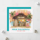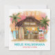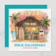 O cartão tropical de Natal apresenta Papais noeis desfrutando de férias em um bar Tiki na praia ao pôr do sol com palmeiras, luzes de cordas de férias e saudações havaianas "Aloha" e "Mele Kalikimaka". Cocktails tropicais, abacaxi, hibisco e folhas de palma, prancha de surfe e papagaio num pirata que decora a área do bar. O reverso é azul-verde-turquesa, e a saudação e os nomes podem ser personalizados. Arte por KL Stock