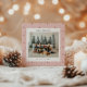 Cartão de férias com um fundo de papel de parede listrado vermelho e rosa com uma foto de família combinada com uma saudação de férias e seu nome e ano em uma fonte sem serifa.