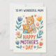 Cartão de Dia das Mães com uma cena ilustrada calorosa de uma mãe urso abraçando seu filhote, cercada por flores e corações. Inclui a mensagem “Para Minha Maravilhosa Mãe” e “Feliz Dia das Mães”. Projetado para transmitir afeto, cuidado e apreço, adequado para presente de Dia das Mães de crianças ou adultos.
