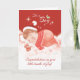 A ilustração neste adorável cartão "Parabéns, é um menino" retrata um lindo menino dormindo em nuvens brancas fofas. Concebido especialmente para meninos nascidos durante a época de Natal, o cartão é principalmente vermelho com um raminho de azevinho e o bebê está usando um pequeno chapéu de Papai Noel vermelho. Ele está aninhado sob um cobertor vermelho macio com um ursinho ao seu lado e o doce verso dentro se refere a ser o seu primeiro Natal.