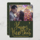 Tipografia contemporânea moderna e elegante em dourado e verde caçador escuro Feliz Ano Novo cartão de saudação com uma foto de família personalizada na orientação horizontal na parte frontal e padrão de confetes dourados no verso. Personalize com sua assinatura! -------- Por favor, note que a cor do fundo é editável. Para alterá-la, selecione a opção personalizar adicionalmente.