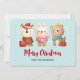 Um cartão de Natal achatado, com uma ilustração fofinha, com um coelho, um urso e um veado, todos vestidos com equipamento festivo. Adorável e caprichoso.