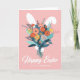 Cartão de saudação de Páscoa bonito com um coelho branco segurando um buquê de flores coloridas de primavera. "Felz pascoa" é exibido em letras em negrito com seu nome mostrado abaixo. Personalize a dentro da adorável placa de Páscoa adicionando sua mensagem digitada ou manuscrita. A parte traseira da placa apresenta um padrão floral correspondente.