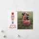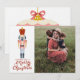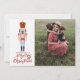 Este cartão de Natal de Quebra-Nozes é uma lembrança de dias passados, com um toque moderno. O design apresenta um quebra-nozes de Natal vintage rosa e vermelho em um fundo branco. Diz "Desejando um Feliz Natal" com um espaço para adicionar sua foto favorita. No verso há outro ornamento com uma mensagem que você pode personalizar e adicionar seus nomes.