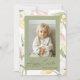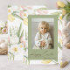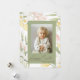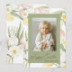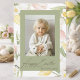 Welcome spring and celebrate Easter with this elegant personalized photo card featuring soft watercolor pastel pink tulips and sunny yellow daffodils. A calming sage green photo frame highlights your favorite family photo, while graceful script typography adds a timeless finishing touch.