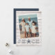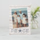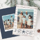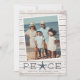 O cartão de Natal no estilo praiano chic adiciona um charme à beira-mar aos seus cumprimentos de Natal. Perfeito para compartilhar fotos de férias, ou para famílias que moram em locais costeiros, tropicais, de clima quente ou insulares, este design alegre apresenta uma única foto favorita em um fundo com aparência de prancha de madeira clara com a palavra "paz" ao longo da parte inferior. Uma estrela-do-mar substitui a letra "A" para um toque praiano fofo. Adicione sua mensagem de Natal personalizada e seus nomes ou o nome da família, junto com uma foto adicional e uma mensagem personalizada no verso.